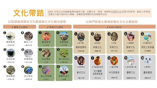 文化部自2020年起推動「文化帶路」,以回溯臺灣歷史文化脈絡尋找主題,逐年建立文化遊程,作為推動文化觀光核心內涵,讓文化帶路,邀請民眾走入深度文化之旅,體驗美好臺灣。延續2023年基於糖業與茶業等臺灣文化路徑主題各6條文化遊程;2024年基於熱門影視作品主題之10條文化遊程;2025年正以北回歸線臺灣段為主題,探索臺灣北回歸線文化路徑並規劃遊程,北回歸線穿越全球22個國家,多為沙漠、草原等乾燥環境,唯獨臺灣,受季風帶來豐沛水氣、熱帶暖流創造溫暖濕潤環境及板塊擠壓形成唯一最高海拔山脈「高山島嶼」,讓臺灣擁有熱帶、溫帶、甚至寒帶自然景觀,造就複雜而多樣生態系,也塑造多元人文風貌與性格,這些臺灣獨特故事,深具國際旅遊魅力。