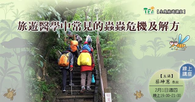 親近大自然是多麼令人期待且深具吸引力,有萬全的準備,可以為每一趟旅程留下美好難忘的回憶。根據疫情的統計,臺灣的離島觀光相當熱門;高山探勘也日益興盛,也因此增加野地接觸的機會,若能增加認識生態環境和野生動植物的特性,即可降低病媒蟲叮咬或致病微生物感染的風險。除了國內生態旅遊,近年境外旅遊人口激增,特別是東南亞旅遊、非洲的國家公園旅行等。根據臺灣和歐洲疾管單位的監測,經常可以發現返國民眾入境時發燒的個案,這些民眾後續皆回憶旅途中曾有蚊蟲叮咬 (瘧疾和登革熱)、蜱蟲叮咬 (斑點熱和萊姆病)、跳蚤叮咬 (地方性斑疹傷寒和鼠疫) 或蟎蟲 (恙蟲病) 叮咬的經驗。因此,本次分享將透過國際文獻的回顧、個案病例的報導和實驗室的採樣分析等,提供崇尚生態旅遊的好友們,進一步認識常見蟲咬致病的案例,也期望能做好生態旅遊的規劃,同時也做足預防蟲咬的準備,讓每一次旅遊都精彩難忘!