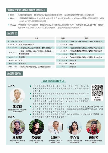 本次論壇將由行政院同時啟動政府與32個臺灣企業ESG及38個民間團體代表的合作儀式,並以「資源保育與環境管理」、「多元文化與人文美學」、「生態旅遊與地方創生」、「全民教育與環境學習」、「身心韌性與健康促進」等5個向度,共同研討福爾摩沙永續軸帶之未來推動方向。