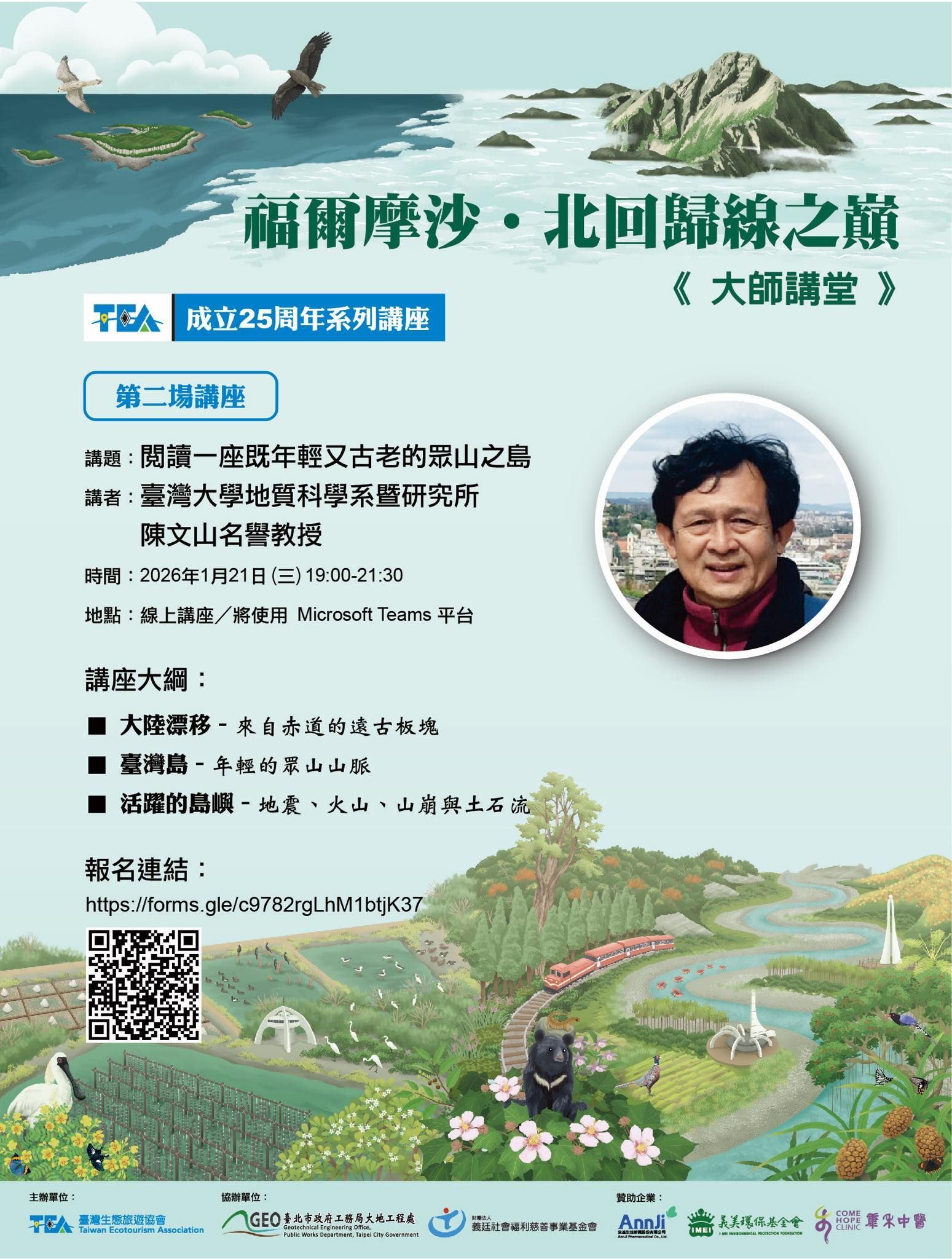 是不是在日常生活中有時會有個突發的臆想,這個地方我好像來過,還是有沒有可能在地球上的某一個角落,有個跟你長成同樣貌的人?!其實生物也有許多有趣的鏡像分布,被稱為「撞到月亮的樹」的臺灣杉,他的祖先可能來自喜馬拉雅山東側的橫斷山脈,這種間斷地理分布的現象,除了讓臺灣的生物多樣性更具特殊性外,也是了解這個北回之巔國度生態特色的一門重要的課程。 臺灣是個多山的島嶼,這些綿延的峰巒或可追溯到500-600萬年前板塊擠壓的造山運動,其後在250多萬年前的冰河期,眾多喜愛寒冷氣候的植物跨越臺灣陸橋,從大陸的高山遷徙至臺灣,當時遺世獨立的臺灣高山成了間冰期喜馬拉雅山東側橫斷山脈東遷生物譜系的避難之所。所以很多盛開在臺灣3千公尺高山的花草,其實跟橫斷山脈有著有趣的親緣關係! 《福爾摩沙.北回歸線之巔大師講堂》講座系列的第三場我們請到臺灣大學森林系的博士、也是《通往世界的植物》及《橫斷臺灣》的作者 游旨价老師來做「臺灣與世界最古老之山之間獨一無二的植物地理連結」的解讀,讓大家一次讀懂福爾摩沙山岳之島的高山植物秘辛! 【第三場講座】 講題 :看世界之巔的奇花異草,不用爬喜馬拉雅山 講者 :臺灣生物地理學家 游旨价老師 時間 :2026 年 2 月 4 日(三)19:00-21:30 地點 :線上講座 報名連結: https://forms.gle/BNKzmpdPUgYcUJGm8 講座大綱: 什麼是「世界之巔」 從臺灣出發,看見世界高山 高山植物的相似生存策略 距離之外的尺度 不用登頂,也能理解世界之巔 【注意事項】 本系列講座名額有限,將依完成報名時間排序錄取,並於報名截止後約兩週內以 E-mail 通知錄取名單。 為協助參與者熟悉 Microsoft Teams 操作,協會將提供線上講座操作指引,並於寄送線上會議編碼時一併附上。 為維護權益,名額將優先保留給「報名成功」之夥伴。如未提前請假而缺席,將取消後續場次資格;如遇特殊狀況,請事先通知協會以利候補作業。