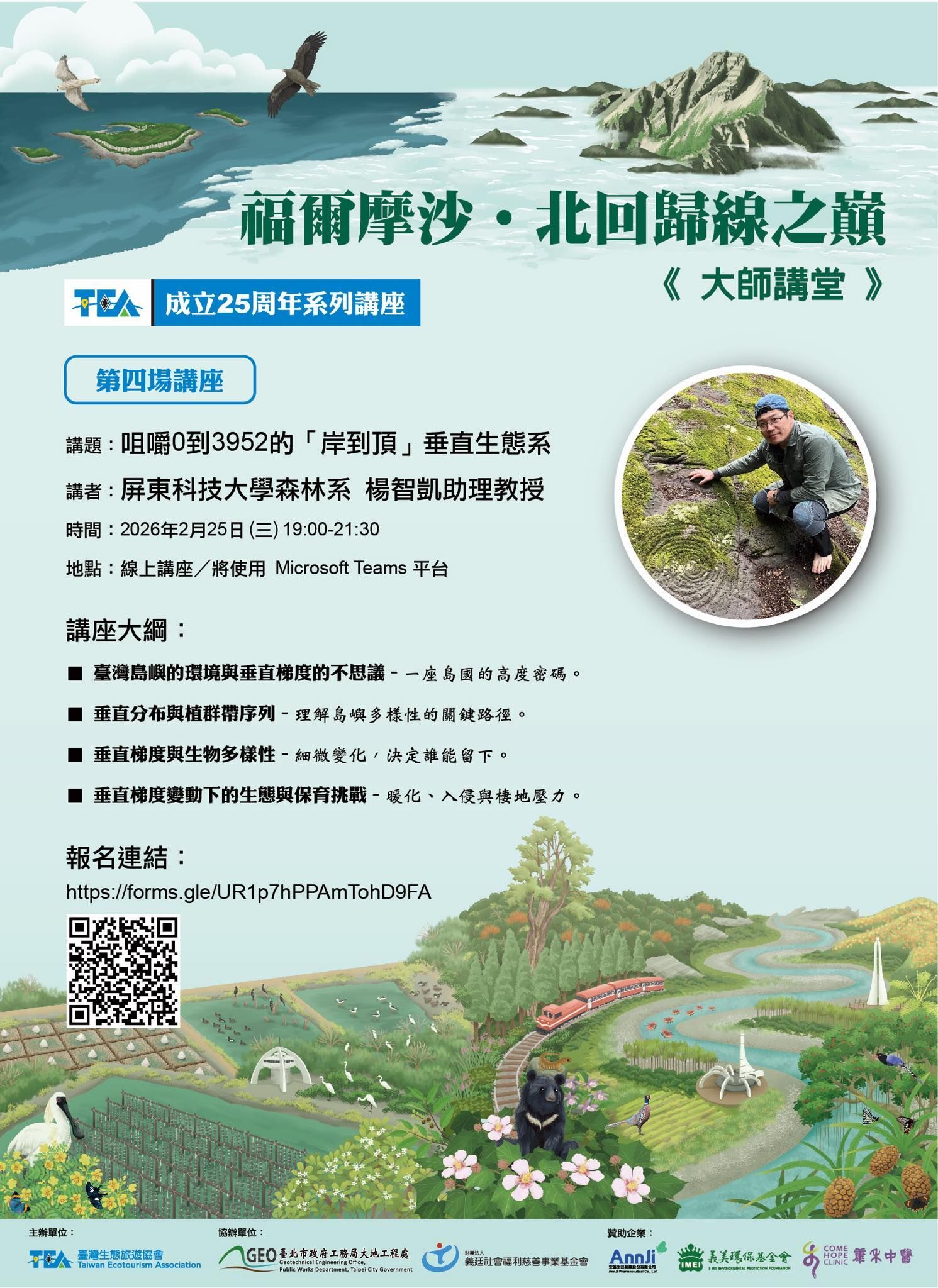 福爾摩沙,這小小多山的國度,太平洋火環帶的地震島,面積雖只列為世界第38大島,但以海拔高度來說卻是全球第4高的島嶼。臺灣是全世界三千公尺以上山岳密度最高的國家之一,在小小3萬6千平方公里的國土面積下,竟然擁有五大山脈及超過268座3,000公尺以上的高山。比較起國人熟知的日本(國土面積近37萬8千平方公里、3,000公尺以上高山21座),高山密度高達百倍;如與拍攝電影「魔戒」的紐西蘭相比(國土面積近26萬8千平方公里、3,000公尺以上高山20多座),高山密度亦高達70多倍。 是什麼造就了臺灣高聳入雲的護國神山群,這個交雜著昔日蓬萊造山運動、歐亞大陸板塊與菲律賓海板塊相互作用下的地震島,有著什麼地質的特殊性,《福爾摩沙.北回歸線之巔大師講堂》講座系列第二場我們請到台灣的地質大師 陳文山名譽教授來做最清楚的解讀,讓大家一次讀懂福爾摩沙的骨架與身高秘密! 【第二場講座】 講題 :閱讀一座既年輕又古老的眾山之島 講者 :臺灣大學地質科學系暨研究所 陳文山名譽教授 時間 :2026 年 1 月 21 日(三)19:00-21:30 地點 :線上講座 報名連結: https://forms.gle/c9782rgLhM1btjK37 講座大綱: 大陸飄移–來自赤道的遠古板塊 臺灣島–年輕的眾山之島 活躍的島嶼–地震、火山、山崩與土石流 【注意事項】 本系列講座名額有限,將依完成報名時間排序錄取,並於報名截止後約兩週內以 E-mail 通知錄取名單。 為協助參與者熟悉 Microsoft Teams 操作,協會將提供線上講座操作指引,並於寄送線上會議編碼時一併附上。 為維護權益,名額將優先保留給「報名成功」之夥伴。如未提前請假而缺席,將取消後續場次資格;如遇特殊狀況,請事先通知協會以利候補作業。