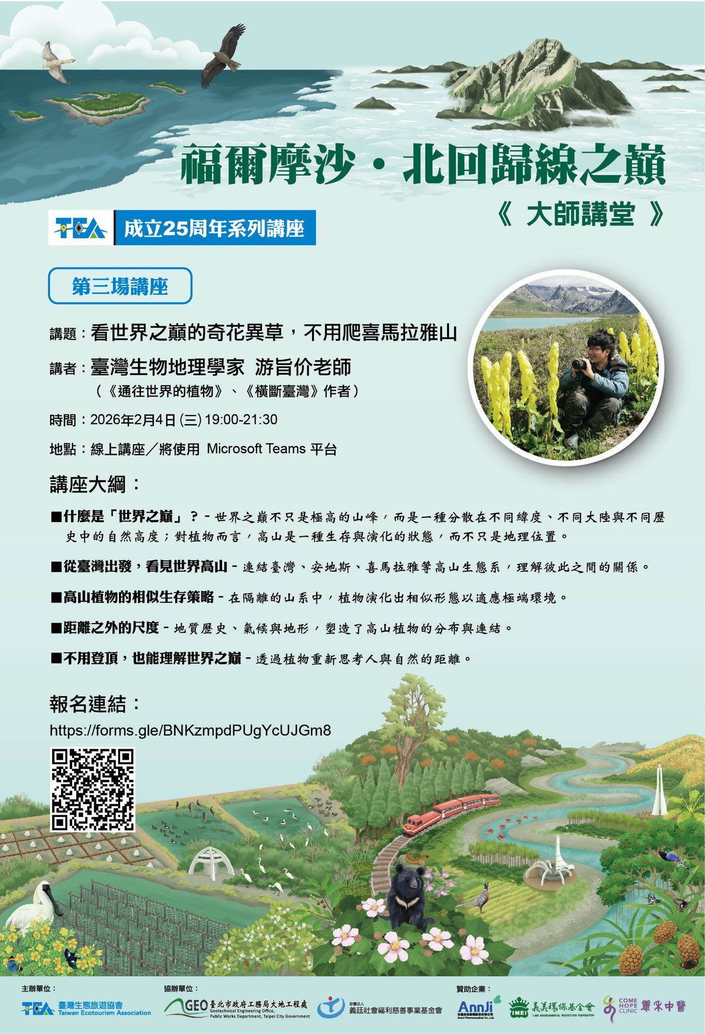 福爾摩沙,這小小多山的國度,太平洋火環帶的地震島,面積雖只列為世界第38大島,但以海拔高度來說卻是全球第4高的島嶼。臺灣是全世界三千公尺以上山岳密度最高的國家之一,在小小3萬6千平方公里的國土面積下,竟然擁有五大山脈及超過268座3,000公尺以上的高山。比較起國人熟知的日本(國土面積近37萬8千平方公里、3,000公尺以上高山21座),高山密度高達百倍;如與拍攝電影「魔戒」的紐西蘭相比(國土面積近26萬8千平方公里、3,000公尺以上高山20多座),高山密度亦高達70多倍。 是什麼造就了臺灣高聳入雲的護國神山群,這個交雜著昔日蓬萊造山運動、歐亞大陸板塊與菲律賓海板塊相互作用下的地震島,有著什麼地質的特殊性,《福爾摩沙.北回歸線之巔大師講堂》講座系列第二場我們請到台灣的地質大師 陳文山名譽教授來做最清楚的解讀,讓大家一次讀懂福爾摩沙的骨架與身高秘密! 【第二場講座】 講題 :閱讀一座既年輕又古老的眾山之島 講者 :臺灣大學地質科學系暨研究所 陳文山名譽教授 時間 :2026 年 1 月 21 日(三)19:00-21:30 地點 :線上講座 報名連結: https://forms.gle/c9782rgLhM1btjK37 講座大綱: 大陸飄移–來自赤道的遠古板塊 臺灣島–年輕的眾山之島 活躍的島嶼–地震、火山、山崩與土石流 【注意事項】 本系列講座名額有限,將依完成報名時間排序錄取,並於報名截止後約兩週內以 E-mail 通知錄取名單。 為協助參與者熟悉 Microsoft Teams 操作,協會將提供線上講座操作指引,並於寄送線上會議編碼時一併附上。 為維護權益,名額將優先保留給「報名成功」之夥伴。如未提前請假而缺席,將取消後續場次資格;如遇特殊狀況,請事先通知協會以利候補作業。