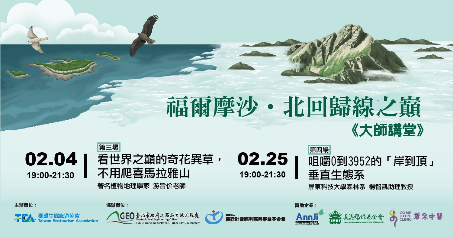 一、緣起 北回歸線軸帶是北半球熱帶與溫帶的氣候區隔帶,其範圍約位於北緯 24°14′39″ (北界)至 22°37′56″ (南界)之間,南北跨距約 180 公里。在北回歸線軸帶所穿越的 22 個國家中,除臺灣、中國、緬甸等富有蓊鬱的森林生態外,其他大多為生態多樣性相對貧乏、地景風貌單一的環境,如撒哈拉沙漠、阿拉伯沙漠、恆河-印度河平原、墨西哥的高原等,而臺灣為此區域軸帶擁有最高海拔、以及在最短空間距離中擁有最大高度變化、最多樣垂直生態環境、與最多地景風貌的國家。 臺灣的北回歸線軸帶含括了阿里山山脈、玉山山脈、中央山脈及海岸山脈等四大山脈,其中玉山山脈為北回歸線軸帶區域中最高的山系,而由澎湖離島至東部海岸直線約 220 公里的空間距離因有將近 4,000 公尺的海拔變化,也造就臺灣這個亞熱帶國家具備有亞熱帶、暖溫帶、涼溫帶、冷溫帶、亞寒帶等生態環境;除此之外,軸帶中豐富多樣的地景風貌,包括海洋、濕地、海岸、沙洲、平原、丘陵、山脈、縱谷、河川及離島等多樣性景觀,伴隨多元的族群文化與豐富的生活產業,構成了臺灣在北回歸線軸帶中的多樣性與獨特性。 為推動「福爾摩沙‧北回歸線之巔」整體願景與行動實踐,臺灣生態旅遊協會特別策劃《福爾摩沙.北回歸線之巔大師講堂》講座系列,邀請國內長期對於相關領域研究且具國際視野、實務經驗的學者專家,透過公開講座與交流對談形式,引領大眾更深入瞭解臺灣在北回歸線軸帶的整體生態地景、歷史文化、人文產業等多面向的獨特性與重要價值。