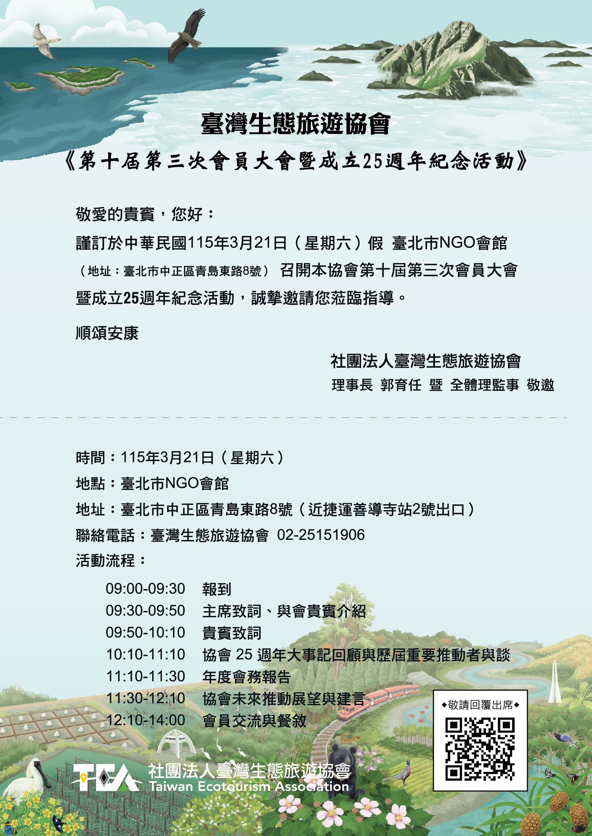 謹訂於115年3月21日(星期六)假臺北市NGO會館(地址:臺北市中正區青島東路8號)召開本會【第十屆第三次會員大會暨成立25周年紀念活動】,